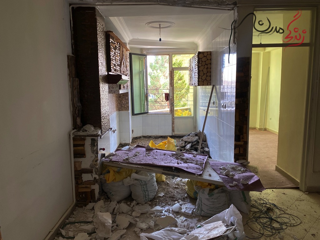 ۱) تخریب سقف سالن و کف آشپزخانه و سرویس ها و خط لوله کف و تنظیم ارتفاع آشپزخانه و سرویس ها