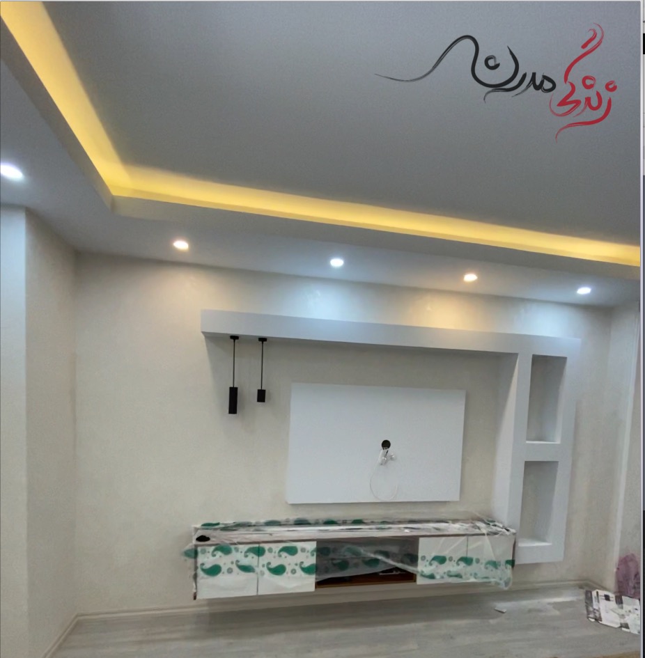 ۳) کناف سقف سالن و آشپزخانه و اتاقها با طراحی خاص و حذف شومینه.